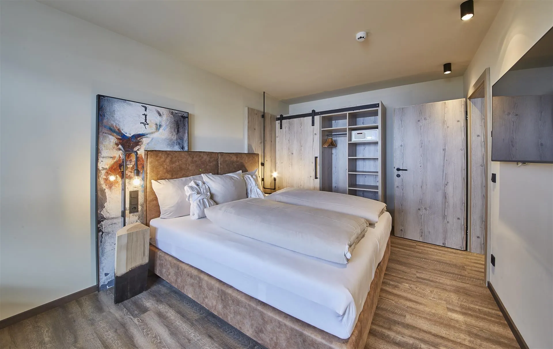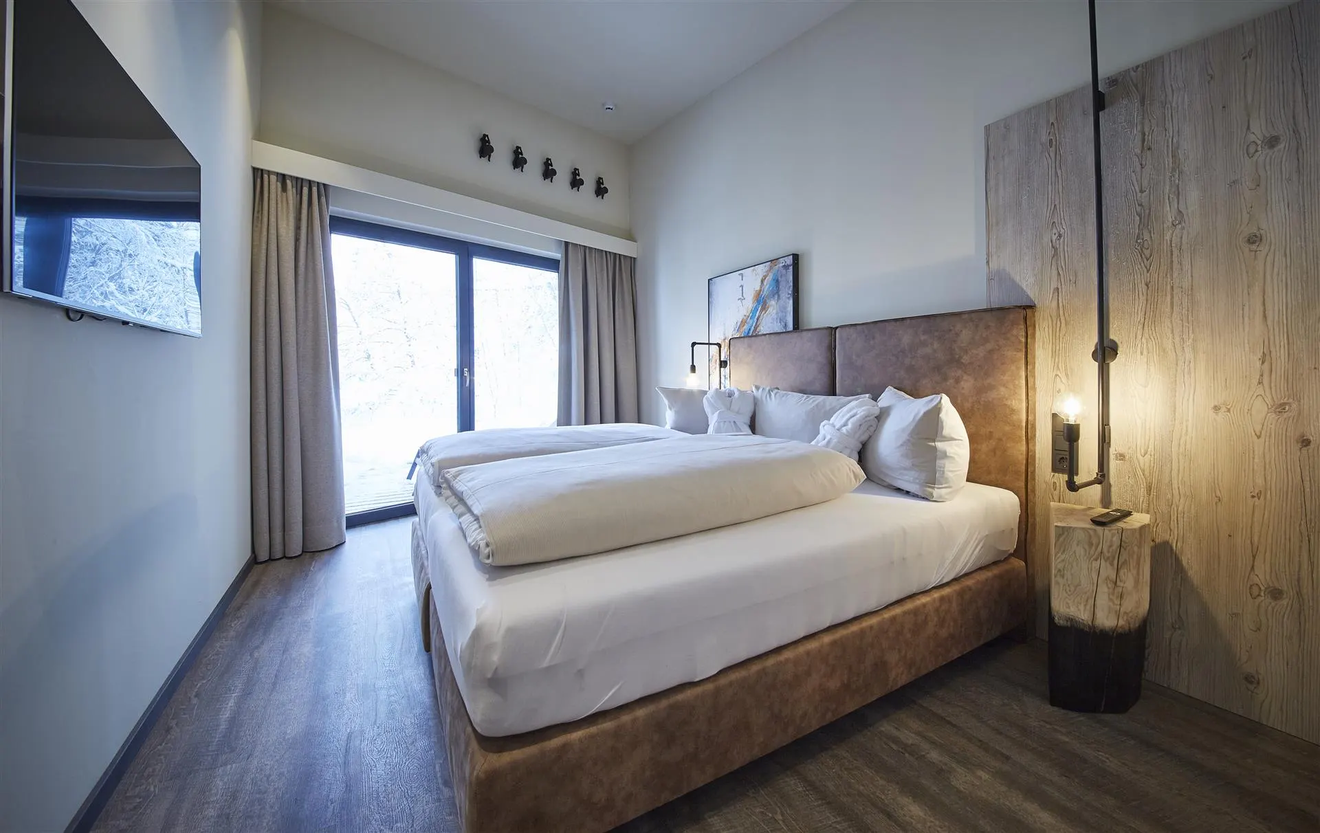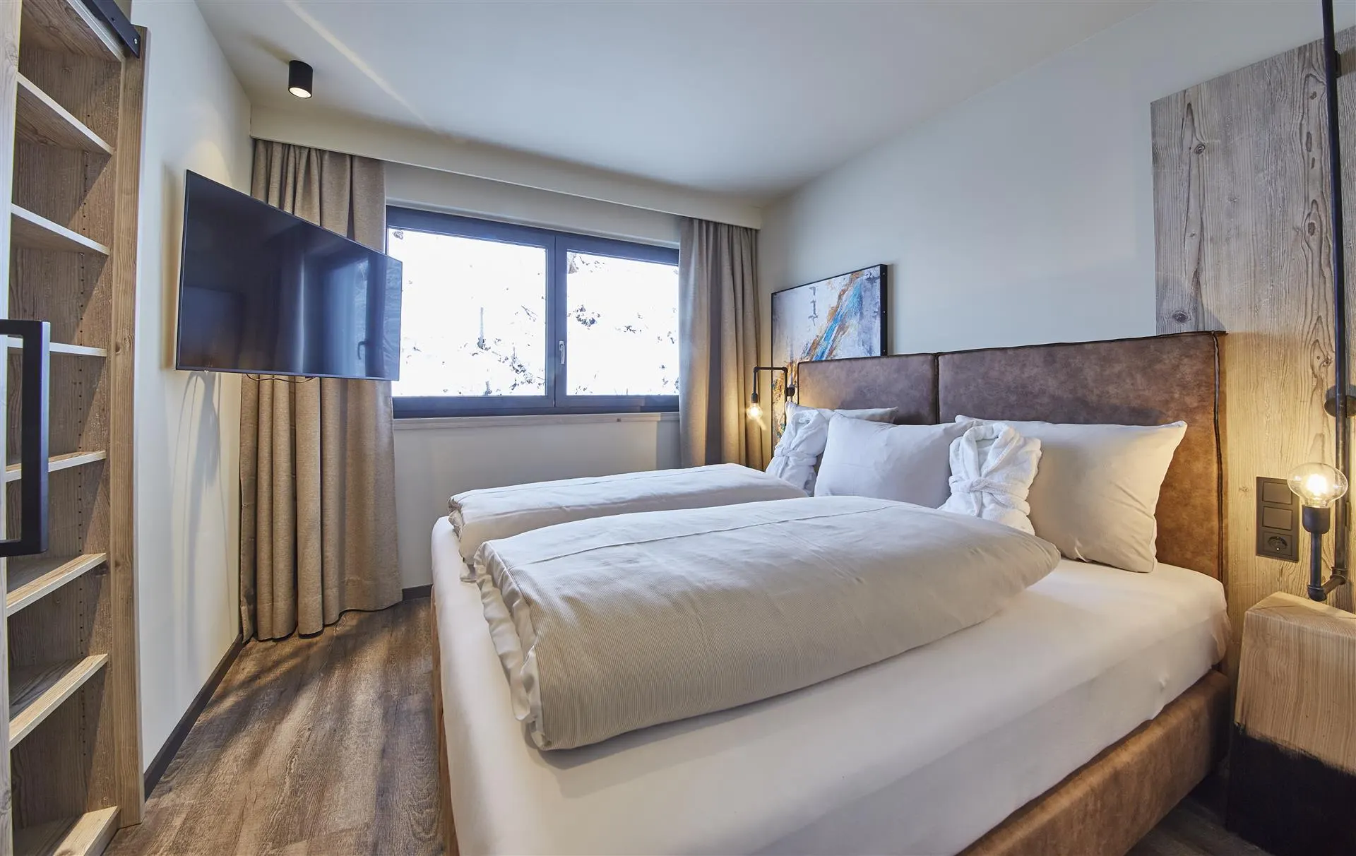 Das “Standard Appartement” ist ausgestattet mit einem Schlafzimmer. Dies verfügt über ein Doppelbett und ein Schlafsofa für eine Person. Es bietet ein Badezimmer mit Dusche und separatem WC. Alle Badezimmer sind ausgestattet mit Föhn, Handseife, Haar- und Körpershampoo, Handtücher und kuscheligen Bademänteln. Hochwertige Boxspringbetten und Matratzen von Joka mit Taschenfederkern garantieren ein erholsames Schlafvergnügen.