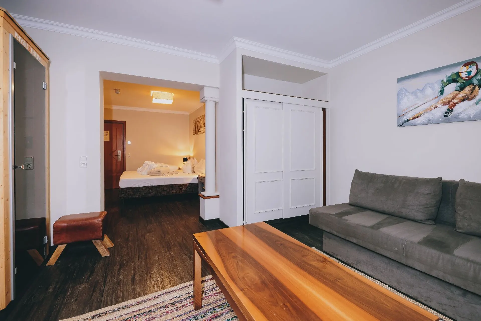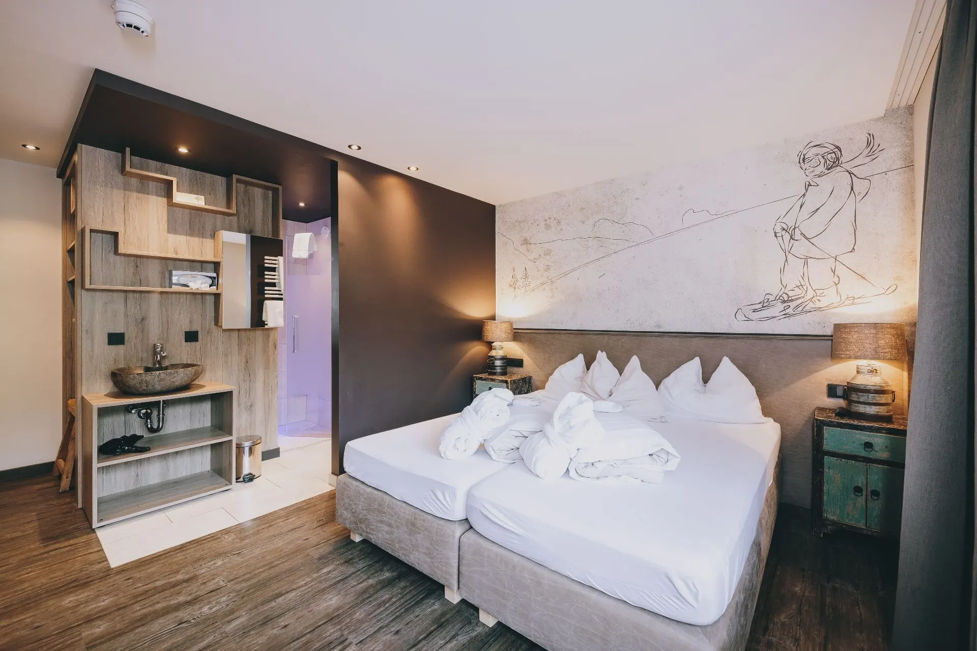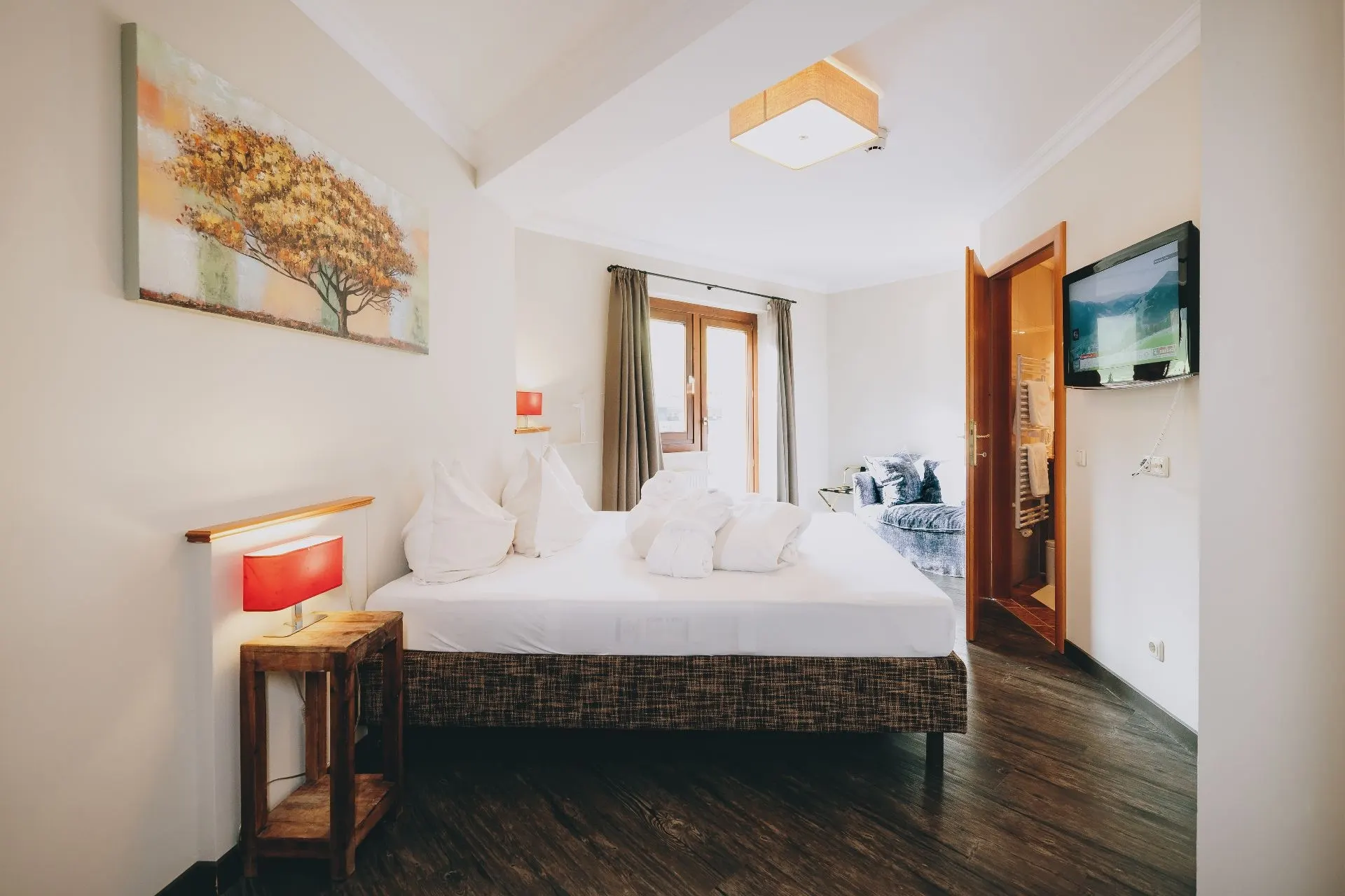 Das “Doppelzimmer Comfort” ist ausgestattet mit einem Kingsize-Designerbett. Hier findet man Entspannung und Komfort. Ein genialer, einzigartiger Blick auf die Berge von Saalbach Hinterglemm wird vom dazugehörigen Balkon garantiert. Dies ist der perfekte Ruhepol nach einem langen sportlichen Tag. Es bietet ein Badezimmer (teils offenes Badezimmer) mit Dusche und WC. Alle Badezimmer sind ausgestattet mit Föhn, Handseife, Haar- und Körpershampoo, Handtücher und kuscheligen Bademänteln.