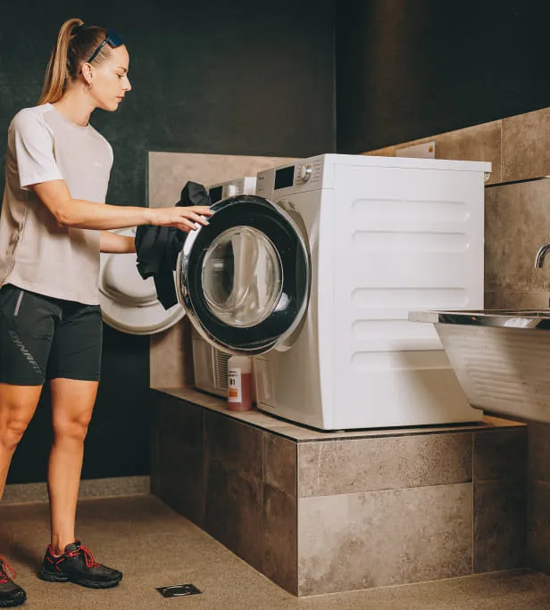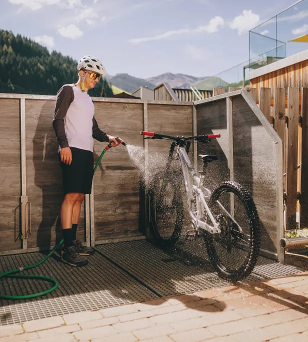 Zwei verschließbare Bike-Räume mit Spinds für jedes Appartement oder Zimmer, eigene Werkbank für kleine Reparaturen, Waschplatz mit Bürsten für dein Bike - und Waschmaschine & Trockner zur freien Nutzung.